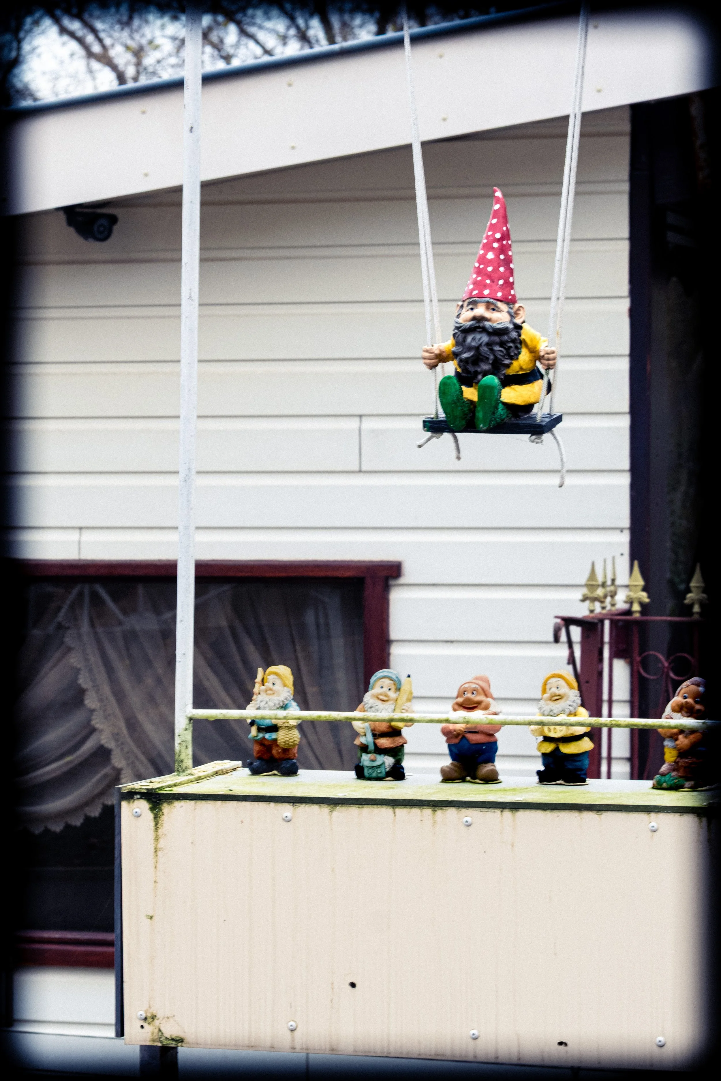 At the edge of the lane, a small assembly forms: coffee in hand,